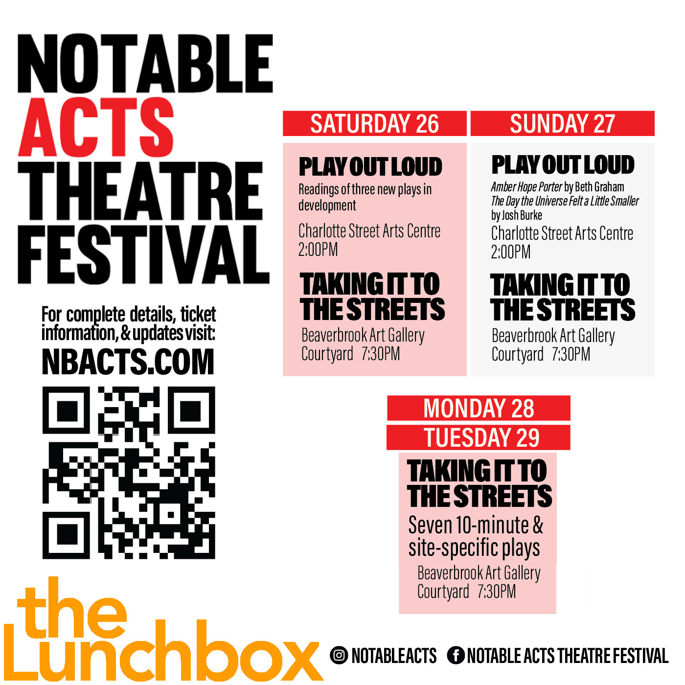 The Notable Acts Theatre Festival runs July 24 through August 3. Amber Hope Porter is part of the second Play Out Loud Readings, on July 27 at 2pm in the Charlotte Street Arts Centre. Don’t Shoot Your Mother is being performed as part of the Taking It To The Streets series, running nightly at 7:30pm from July 28 through July 31, staged in the Beaverbrook Art Gallery Courtyard. For Whom The Troll Tolls is part of the Street Scenes series, running nightly at approximately 8:25pm (following Taking It The Streets). Sinking is part of the Acting Out series, running nightly at 7:30pm from July 30 through August 1 at Memorial Hall on UNB Campus.